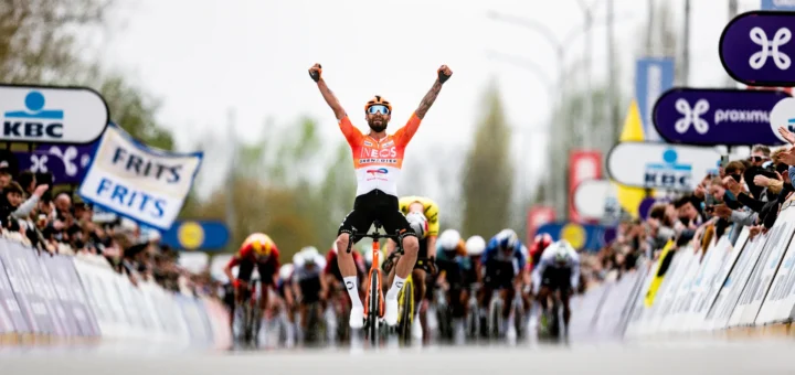 Il ciclista azzurro ha vinto la Dwars door Vlaanderen nonostante una foratura e il manubrio rotto