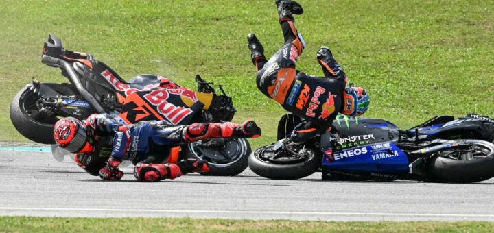 Chute spectaculaire dans le deuxième virage. Les coureurs Quartararo, Miller et Binder sont impliqués dans la chute.