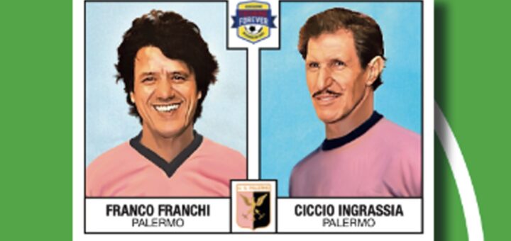 Le couple comique du cinéma italien immortalisé avec le maillot de Palerme dans la série éditée par l’Associazione Figurine Forever.